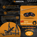 Profesionalni kosi benč + Olimpijska šipka 220 cm + Set gumiranih fi50 tegova (105 kg), gratis flip lock osigurači