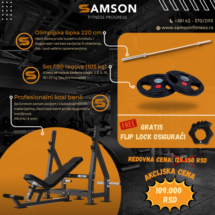 Profesionalni kosi benč + Olimpijska šipka 220 cm + Set gumiranih fi50 tegova (105 kg), gratis flip lock osigurači