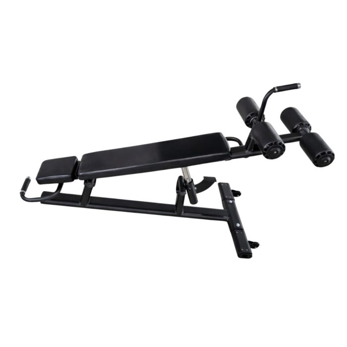 Kosa konstrukcija omogućava progresivno opterećenje i snažniju aktivaciju abdominalne i core muskulature, dok masivna struktura eliminiše uvijanje i pomeranje tokom izvođenja vežbi. Kvalitetno tapacirana ležeća površina pruža visok nivo komfora, a višestruki valjci za fiksiranje nogu omogućavaju preciznu kontrolu pokreta i stabilan položaj tela.